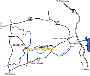 I believe we only visited the bridge. Having already spent a good portion of the day at the Etowah Mounds, we did not take the time to explore the historical district of the town. But, according to their brochure map above, there appears to be a number of things to visit besides the covered bridge. I have reproduced the full text of the brochure, picked up in 2000, providing descriptions of the various places on a separate page linked to the map. Just click on the map to see that text along with other bits of information gleaned from the Internet in 2012 when I prepared this page. Much of the advertising for the City of Euharlee bears the slogan: “She laughs as she runs” - Cherokee. One of the websites I visited (http://www.notatlanta.org/na/Euharlee,_Georgia) further explained: "Euharlee derives its meaning from the well-known Indian name Eufaula, meaning, she laughs as she runs. The area around the small town of Euharlee contains archaeological evidence of earlier Indian civilizations. Present-day Euharlee was settled in the 1840's in the presence of several mills and was called Burges Mill. In 1852, the town was incorporated as Euharleeville and in 1870, a new charter established Euharlee, pronounced U-harley." The Cherokee removal (Trail of Tears) took place in 1838-1839, so the town's founding apparently followed upon the heels of the removal. Prior to that the whole area would have been part of the Cherokee Nation. |