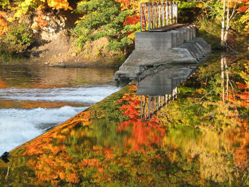 While I have taken any number of superb fall color pictures along this area of the river, I think the next image is the most stunning fall color photo I have ever taken at the dam. I had never seen the constantly flowing water appear so still. I was returning to my vehicle, and had my camera with me, when I noticed the combination of late in the day light, colors, and glass effect of the river. I took 25 shots in five minutes as the light changed, which it rapidly does at that time of day. Having the reflection extend clear to the edge of the dam is extremely unusual. I had never seen it before, and have not seen it since that day (October 3, 2006). The photo is a link to the Fall (Late September thru Mid December) Fitzgerald Park pages. |