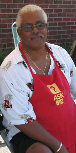 I ordered a Catfish dinner which came with two sides. I think you can tell by the picture what I selected. The brochure also said spaghetti was a "well known specialty of Shirley." Shirley Crutcher is the primary cook, but the "J" in S&J belongs to the friendly fellow pictured below with the "ask me" apron on. He couldn't have realized I had already been pre-sold before he gave me his sales pitch. OK, so they weren't exactly "heart healthy" choices, but it was the best catfish I have had in a long time.