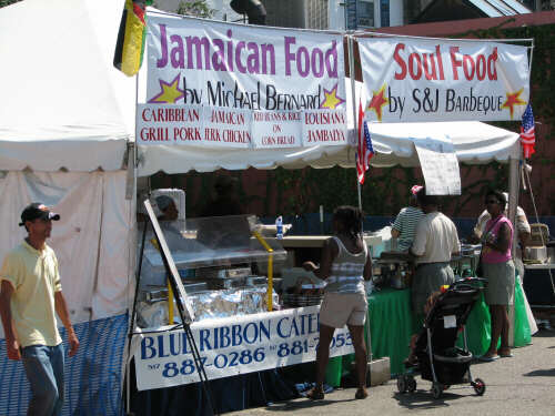 two other areas had food vendors as well. But, I had read in the GLFF program that S&J Barbeque's "delicious, classic African-American menu includes catfish, collard greens, Polish sausage, corn bread (plain and 'Mexican' with hot peppers), spaghetti, and peach cobbler. I did not need to read beyond "catfish" to know where I wanted to go to eat. They told me at the information booth (some men do stop and ask for directions), S&J was located in the Traditional Food Court. So, that is where we headed. |