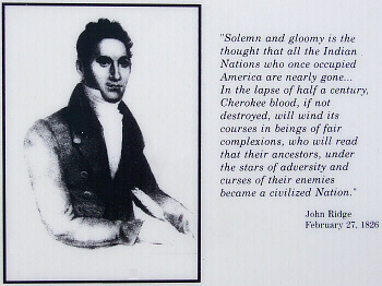 I have chosen to start this page with Harriet because once we start talking about the treaty, the focus will be entirely on Elias and the Ridges; and Harriet, among others, also has a worthwhile story to tell. A sign at the site explains; "She met Elias while he was attending school in her hometown of Connecticut. They were married in 1826 and moved to New Echota the next year. She died here in 1836 from complications following childbirth and is buried in the New Echota cemetery." What the sign does not tell us, I will be quoting from the movie documentary "The Trail of Tears" by Rich-Heape Films (available in both the trade center and our lending library). Elias, along with a few other Cherokees, including his cousin John Ridge, traveled to Cornwall, Connecticut in 1817 to study at the American Board of Commissioners for Foreign Missions school. The school had students from as far away as the South Pacific, and was primarily for "people of color." "White America had extended a promise to Native Americans. They could become civilized and they could become Americans. And, they could participate as equals. What Ridge and Boudinot found, in fact, was that the promise was empty." While in Cornwall, Elias and John fell in love with two daughters of the town. Elias' wish to marry Harriet, and John Ridge's desire to marry Sarah Northrup, were "met with such disapproval that at one point Harriet watches town members, people that she knows, that she goes to church with, burning her in effigy because they are so upset with her decision to marry Elias Boudinot. The girls of her choir show up to church with black armbands to demonstrate their mourning of her decision to marry this --- the newspaper uses quotes like 'dusky son' or 'savage son.' These same people who had welcomed them with open arms as 'children of the forest' now were completely in arms because they had married white women . . . . . . after this incident Boudinot and Ridge were very well aware where they stood in America. They could be civilized; as civilized as they wanted to be. They could be as rich as they wanted to be. But they were not white, and white America was not prepared to accept them on an equal basis." Harriet took a lot of flak, and showed great courage and fortitude in following her heart. I felt it was worthy of a moment's reflection. |