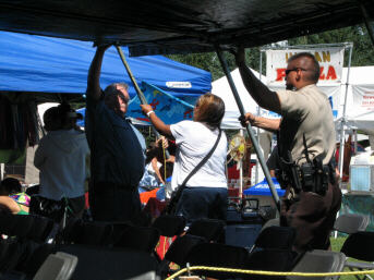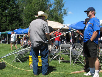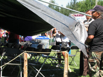I mentioned the elders tent on page one. If you have not picked up on it from some of the images so far, let me share with you that it was indeed a "Winnie the Pooh" blustery kind of day. Every so often a wind gust would lift somebody's tent up just enough to inspire them to quickly grab it and secure it a little better. However, the elders tent did not fare as well. Apparently, after a few mishaps they decided it could not be properly secured because they started dismantling it around a quarter to two that afternoon. The elders joined us in the visitors area, which as it turned out, being right next to the announcer's building, was quite adequately anchored to a telephone pole. |