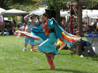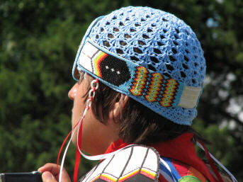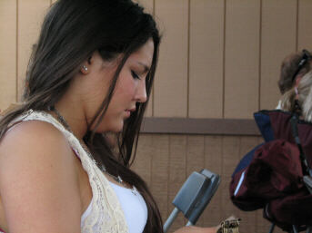 Spectators are not the only ones taking pictures at a pow wow (below right) In fact, the now common feature of cell phones including a built-in camera has added a whole new dynamic to photography everywhere, and pow wows are no exception. I thought I was positioned in quite the exceptional spot for photo taking until I saw the vast numbers of dancing relatives and friends using the arena entrance as a place from which to use their camera phones to take pictures of their children and other fellow dancers. I spent a large portion of the day shooting around, between, and over people standing there. Also, I had to smile that things are pretty much the same wherever you go, with the young lady (below left) spending a good deal of her time . . . (I am guessing) texting? |