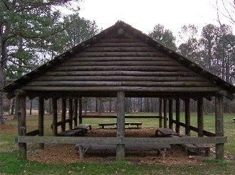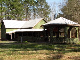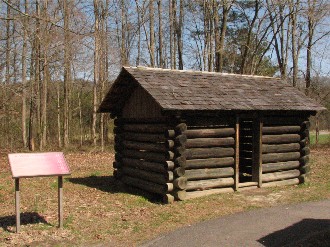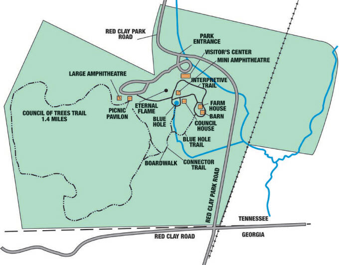 "This state historic area has been developed to preserve and commemorate the council grounds that served as the defacto capital of the Cherokee Nation from 1832 until 1837. The 260-acre park includes an interpretive center, reconstructions of the council building and a Cherokee farmstead, hiking trails, a picnic area, an overlook tower, and a 500-seat amphitheater. The focal point of the Red Clay park is the Council Spring, a large blue spring that issues more than a half-million gallons of water a day. In the early nineteenth century, the Council Spring was located in the midst of a dispersed community of Cherokee farmsteads known as Red Clay or Elawohdi, home to Charles Renatus Hicks, assistant principal chief of the Cherokee Nation. Beginning in 1816, Hicks hosted a series of national council meetings at Red Clay, establishing precedent for its later use. These general councils were often huge affairs; thousands of Cherokee citizens attended sessions and socialized at meetings that lasted days or weeks." |