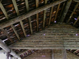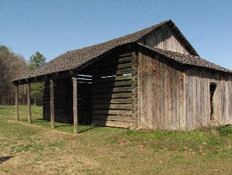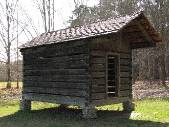 Cherokee Farmstead (sign text) Cherokee farmsteads varied greatly according to the wealth and the degree to which the family had adopted European ways. Each site, however, had three basic components: the living area, the cultivated fields, and the woodlands. The Cherokee farmer who used a plow, was working to produce corn; the same crop his ancestors had tended with digging sticks and stone hoes. The earlier Cherokee family grew corn to insure themselves and their relatives of a winter food supply. The nineteenth century Cherokee farmer grew corn not only for food, but to fatten pigs for sale on a competitive market. The Cherokee farmstead reflected change from group oriented harmony to an individual struggle for wealth. This non-traditional urge to acquire and protect individually owned private property contributed to the sweeping social and political changes in Cherokee life during the first quarter of the nineteenth century. The buildings replicated here represent a Cherokee farmhouse, barn, and corncrib. |