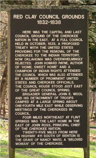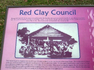 "The events that made Red Clay famous happened between 1832 and 1838. Red Clay served as the seat of Cherokee government from 1832 until the forced removal of the Cherokee in 1838. It was the site of 11 general councils, national affairs attended by up to 5,000 people. Those years were filled with frustrating efforts to insure the future of the Cherokee. One of the leaders of the Cherokee, Principal Chief John Ross, led their fight to keep Cherokee's eastern lands, refusing the government's efforts to move his people to Oklahoma. Controversial treaties, however, resulted in the surrendering of land and their forced removal. Many of the Cherokee people who met at Red Clay had made remarkable advancements and lived much like the dominant culture. Many of the Cherokee had adopted the Christian religion, and their political and judicial systems were similar to that of the United States. Sequoyah (George Guess) had developed a syllabary that made it possible to write the Cherokee language. The Cherokee published the Phoenix, a bilingual paper from 1828 to 1834. In spite of the social and political advancement made by the Cherokee, Red Clay proved to be the Cherokee's last refuge – their capital in exile – before being moved westward from their homeland in the southeastern United States." |