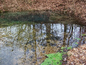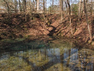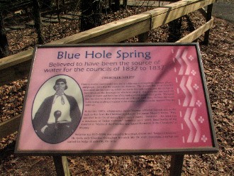 "Many call this sacred spring the Blue Hole, a natural landmark of the council grounds. It rises from an underground cave below the rock ledge and flows to the Conasauga and Coosa River systems. Some 504,000 gallons of water flow through here every day at a rate of 350 gallons per minute. The spring maintains an annual temperature of about 56 degrees and is approximately 14 feet deep. The spring provided water for the people at the councils and was a sacred place to them." |