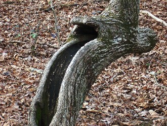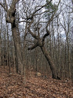 Along the trail we came upon the Overlook Tower, although at the time we did not know what it was. We did not even know it was there, since it is not shown on the brochure map. We actually found it quite puzzling as it is very elaborate but had no signage to let you know the what, when, or why it was built. Although all of the sites I visited in preparation for creating this page mention an Overlook Tower, none of them offered any information about it either. Also, notice the couple of bent trees in the below pictures. On April 12, 2011 we were visiting the small museum at Tunnel Hill in Georgia. Through the course of conversation, in explaining what I do, I mentioned my Cherokee family heritage, at which point we were invited to come back that evening for a free presentation of "The Trail Tree Project" which was quite informative. In December of 2011, Don and Diane Wells, in an announcement for their book Mystery of the Trees, explain; "The meanings of these trees are not completely known and may never be known since most of those who know are all but gone. Some of these trees are found marking old Indian Trails. Others point to water, shelter, stream crossings, medicinal plant sites and more. The techniques for bending a tree into a particular shape, for the most part, have also been lost. However, these 'living artifacts' are a testimony to the skills and knowledge of the Indian people as they lived their lives with the idea of being one with nature." I have not checked to see if any of the trees at Red Clay are among the more than 1800 listed in the Trail Tree Database, but they are interesting. |