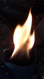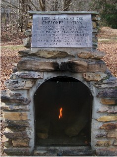 "The Cherokees carried hot coals from their council fire at Red Clay on the removal to Oklahoma. In the 1950's the flame was transported to Cherokee, NC, and then in April 1984 ten Cherokee runners with torches returned the fire to Red Clay, demonstrating that the Cherokee spirit is unquenchable." |