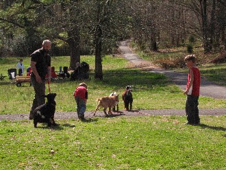 The thing I needed to keep in mind on our second visit here, when there were more people around, is that in addition to being an historical site for the Cherokee, Red Clay is simply a local park for many of those who come here. The above picture is not, of course, the 500-seat amphitheater. This is shown on one map as the Mini-Theater. We did pass through the large amphitheater coming off from The Council Of Trees Trail in 2004. I did not take any pictures of it, but I remember we paused and sat for a moment, because I recall striking up a conversation there with one of the few other people in the park that day. She was a Christian woman who could not understand how I could honor my Cherokee family heritage, particularly maintaining a number of traditional perspectives, and yet still be a Christian. We had a pleasant enough conversation, and I gave her a card with my website address, but it was a good reminder for me that a number of people still perceive anything Indian as being incompatible with Christianity. This section finishes the page with several miscellaneous images, including a special occasion photo shoot going on by the spring (here is where you can see the remodeled bridge), pictures of some park visitors who got my attention because they brought along their goats, and an old goat (the one wearing the Cherokee ball cap) with his wife. |