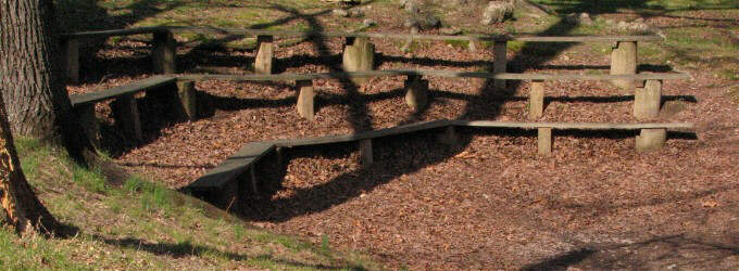 Red Clay Council (sign text) Between 1828 and 1830, Georgia passed laws prohibiting the Cherokee from meeting for any purpose other than to sign a treaty giving up their land. The council that had been meeting in the Cherokee “capitol” of New Echota, Georgia, met once in Alabama in 1831, and then moved here to Red Clay in 1832. The council met here until just before removal in 1838. Three archaeological investigations between 1973 and 1976 failed to determine the exact location of the council house. The reconstruction is based on the only eyewitness report of the structure from the period of the councils of the 1830’s. This description identified the council house as “a simple parallelogram formed of logs with open sides, with benches for the councilors.” More recent investigation suggests that the structure may have been much larger than this replica, possibly having an opening in the roof to allow smoke from the council fire to escape. Benches like those here would have lined the perimeter to allow for seating of the delegates from each of the eight districts. |