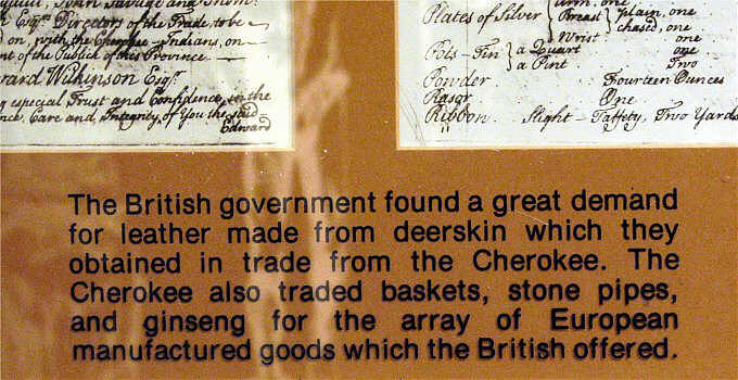 Cherokee Hunter (display text) Carrying a European or American-made gun, and wearing clothes made of cloth from the mills of England, the Cherokee of the 18th century hunted the white tail deer, whose hide he would trade for more manufactured goods. This tradition of trade was to move the Cherokee from their native culture to one remarkably similar to that of their American neighbors in less than a hundred years.