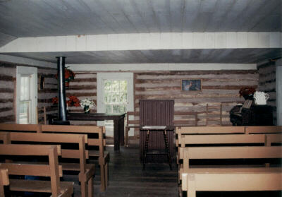 During revivals, a brush arbor might be built to accommodate the larger crowd, and members would bring bedding and camp on the grounds overnight. The New Hope church building in Adams Corner Rural Village was not originally a church . . . it was donated and moved to Adams Corner to represent an early church building." The interior shot is of the church. |