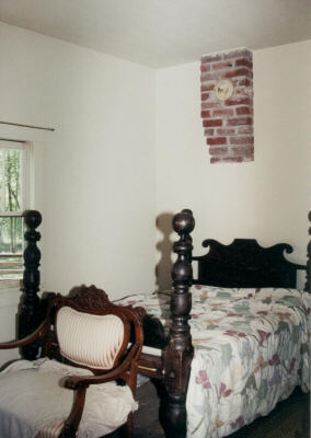 "Cherokee women were known to be fine weavers. The White Frame House is set up with a loom and a spinning wheel so that visitors may see how fabric was made for families in rural areas of the Cherokee Nation. The white board-and-batten, two-roomed house represents a transitional time in a house’s life. Board and batten construction provided a quick and relatively inexpensive way to construct a home. The batten covered the space between the board siding and often was wallpapered with newspaper in hopes of further preventing drafts. In time, walls could be studded and insulated with a wall board surface added to the interior. Much of a fireplace’s heat went up the chimney, and the availability of cast iron stoves proved more efficient. As cast iron cooking stoves became affordable, the owners of a house with a fireplace might choose to close up the fireplace and install a simple chimney to serve both the cooking stove and the heating stove. Not wanting to pull down the earlier chimney, and not wanting to sacrifice the old mantel that had become well-polished through use, the fireplace opening was simply shut up while the mantel and chimney were retained. Furniture could then be arranged close to what-used-to-be the fireplace. Small houses required ingenuity. When the heating stove was installed in the winter, the loom might need to be dismantled and stored in the attic. A woman raising children might have to delay some creative activities until her children were grown. A widow might need marketable skills in order to support herself and retain her home. Spinning and weaving were activities that produced much-needed durable fabric. Sewing machines aided in the quicker production of clothing, something for which the woman of the house was generally responsible. Quilting, tatting, and embroidery were much valued skills. The bed did not have bed springs, but ropes were intertwined to make a surface that would adjust to pressure points. Periodically, the ropes would have to be tightened, as they would stretch with time. Houses did not have built in closets, but instead the few clothes owned by the family were kept in a piece of furniture called a wardrobe." |