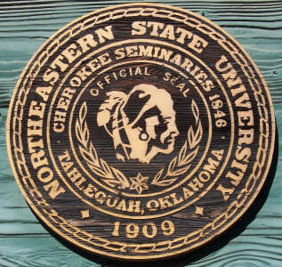 I took the above photo of Northeastern State University during our December 2004 visit. You can just make out some of the lettering on the arch which acknowledges the Cherokee Female Seminary connection. That history is also shown in the university seal shown below. |