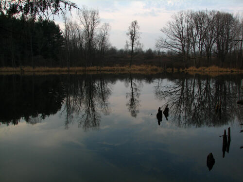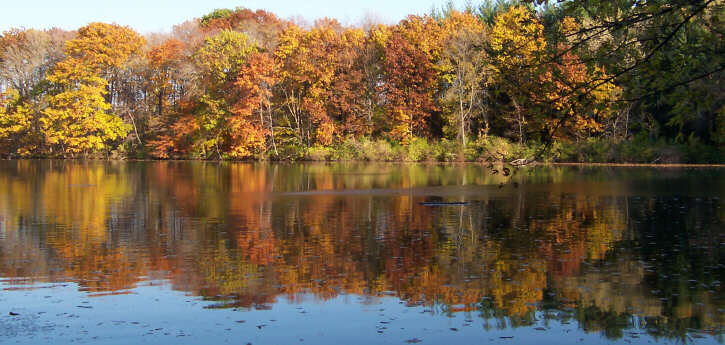 The Woodland Pond (see above) is partially adjacent to the pines as shown on the map. There is also a smaller pond just west of the pines. I have included pictures of it on the Pines Plantation page because it is so close in proximity. Staying with the waters of Woldumar for a moment, you can see on the map (and mentioned in the text) that there is a fair amount of river frontage and a rather large lagoon stemming from the river. Sometimes, the colors along the lagoon in the Fall are absolutely stunning. The below photo, taken late in the season, only hints at the beauty I have seen in this area. Unfortunately, I have never, to my satisfaction, captured the peak color in a photograph. As you are likely guessing by now, you can click on the photograph to jump to more images of the Lagoon & Riverfront, or you may wait until scrolling down through rest of this page, where you will find a link among the others already mentioned. |