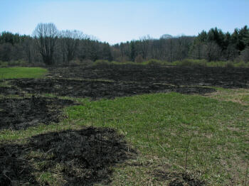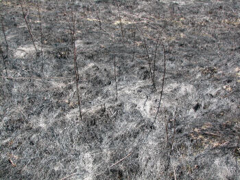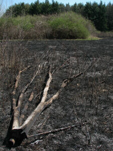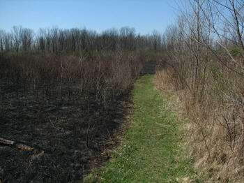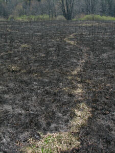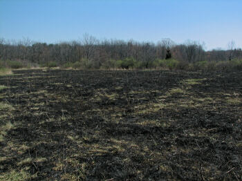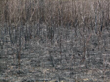 As we leave the water areas and head into the woods or onto the prairie, I would like to take a moment to mention the controlled burns which must take place occasionally to keep the prairie healthy. For too long we failed to understand the importance of fire in the cycles of life. Today, as we learn more, contained fires strike a balance long absent from our environmental efforts. It does make for a rather interestingly textured landscape though, as you will see in the following pictures. Since this is the only page they appear on, I have included several images I took after a burn in April of 2007. |