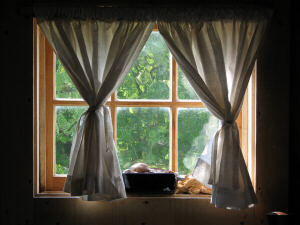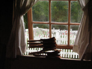I am particularly fond of the special effects produced by the waviness in old glass. The first row below has some of my favorite shots from outside of the cabin, which is followed by a few porch area items, then we will head inside for a look around. Most inside pictures are from either (open to the public) the Wildflower Weekend or American Heritage Festival. |