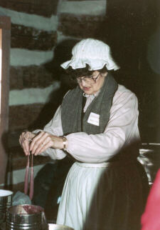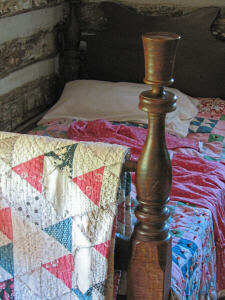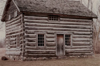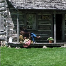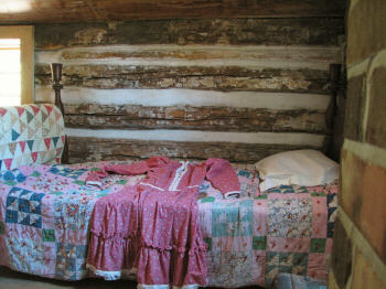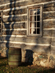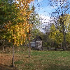 The above photos were taken in 1990 and 1991 (35mm images). The photos of the people were taken on October 20th inside the cabin, so I suspect it was the American Heritage Festival (or its predecessor) which originally occurred later in the fall than it does now. Everything below was photographed using my digital camera, so they are from 2003 or later. You can see the changes to both the cabin, which by 2003 has had a front porch added to it, and the grounds surrounding the cabin. |