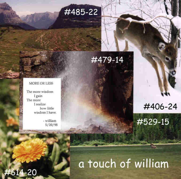 william's picture of the week (WOW) is a single downloadable image I pick and place online each week (or so) in a larger file size and dimensions not typically used anywhere else in the website. The montage of images next to the options list was the original opening picture for my a touch of william page when I started the website in 2002. Long before my website days, things pretty much began with my a touch of william Poetry & Pictures books (actual physical photo books). Everything else I do grew out of a touch of william. |